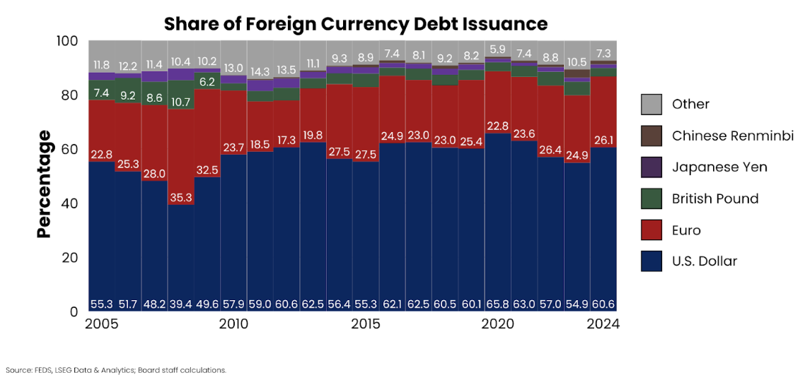 Perhaps nowhere is dollar dominance more pronounced than in international debt markets. Approximately 60% of all foreign currency debt issued globally is denominated in US dollars,a figure that has remained stable since 2010. This creates a structural dependence on dollar funding that extends far beyond US borders.