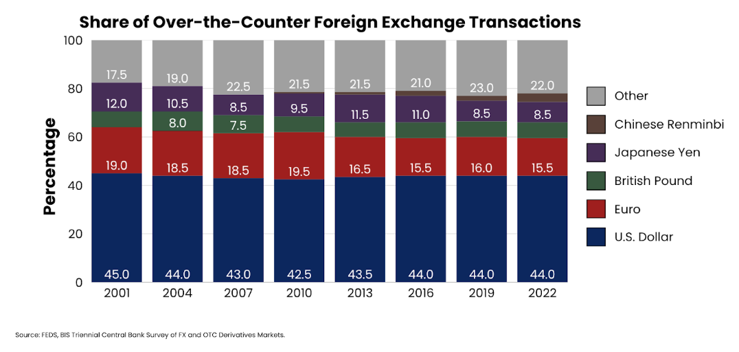 The foundation of dollar dominance lies in the foreign exchange market, where 44% of all global currency transactions in 2022 involved the US dollar as one side of the trade. This figure, drawn from the Bank for International Settlements' triennial survey and adjusted to show single-currency participation rates, represents a remarkable consistency—the dollar's share in FX markets has remained virtually unchanged over two decades, hovering between 42-45% since the early 2000s.