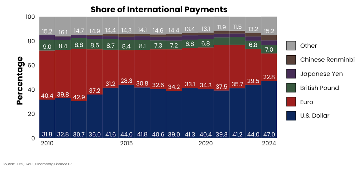 Sources: FEDS, Atlantic Council, Investopedia, GCSP, European Central Bank, J.P. Morgan, BIS, IMF, Central Bank of the Republic of China, Boz et al., SWIFT, Bloomberg, LSEG